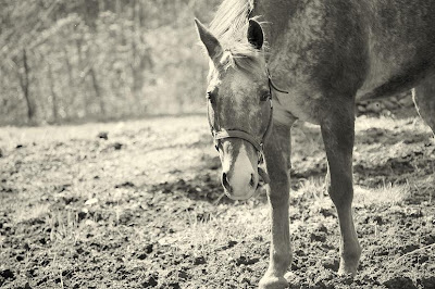 I'll never really know why he paused. I can only imagine exactly what he was thinking. He didn't like the mud? He didn't want to be caught? He heard something in the woods? But I like the lowered position of his head, the ears going two different directions, the breeze blowing lightly on his mane and forelock. I just don't know if I like it better in color, or in black and white!